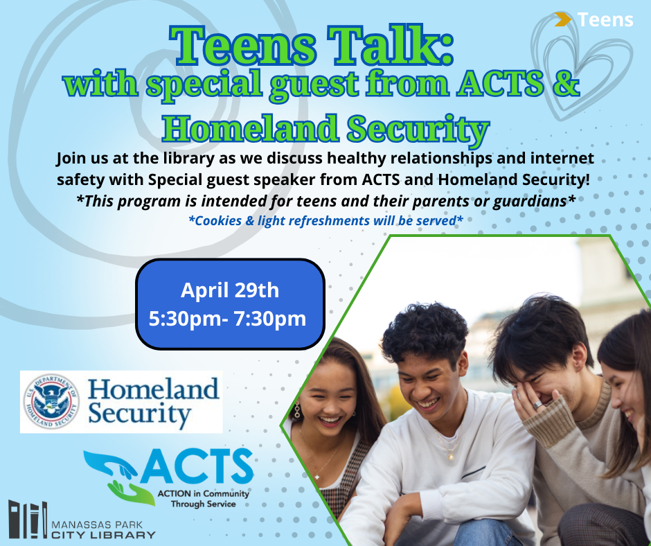 Teen Talk: Join us at the library as we discuss healthy relationships and internet safety with a Special guest speaker from ACTS and the Secret Service!
