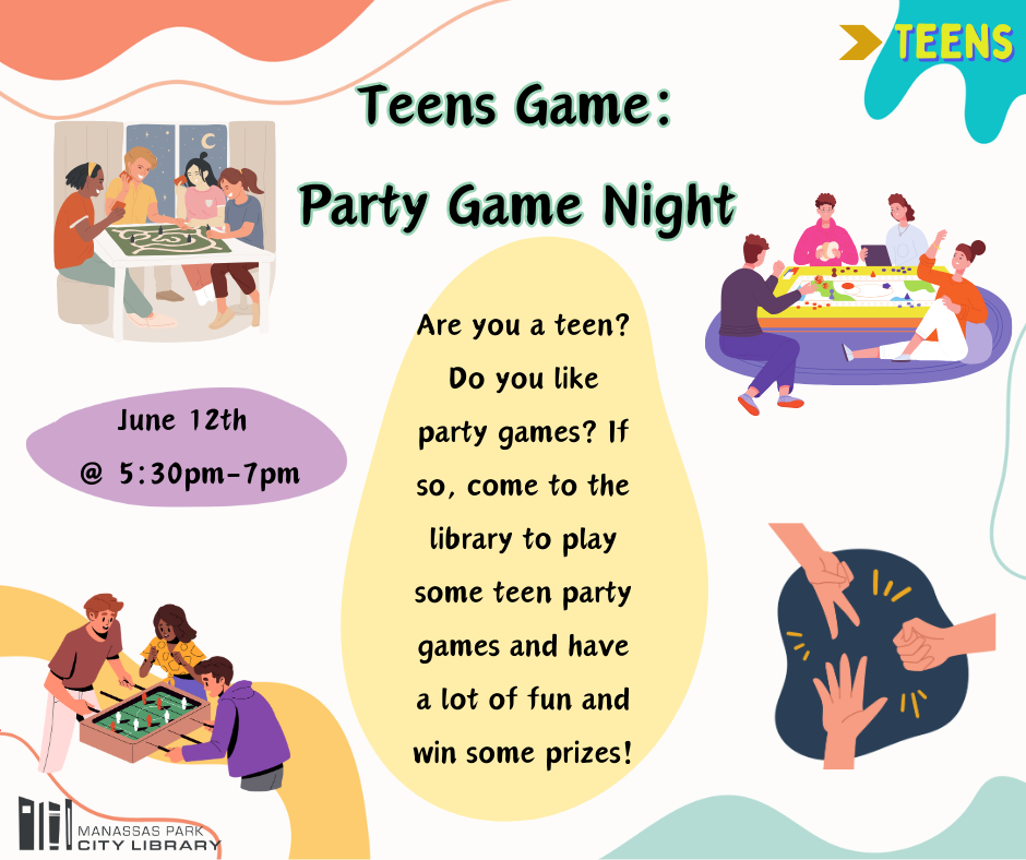 Are you a teen? Do you like party games? If so, come to the library to play some teen party games and have a lot of fun and win some prizes!