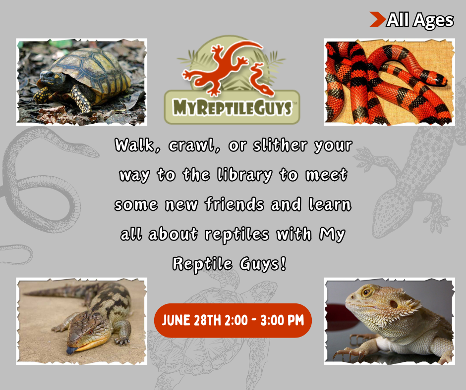 Walk, crawl, or slither your way to the library to meet some new friends and learn all about reptiles with My Reptile Guys!