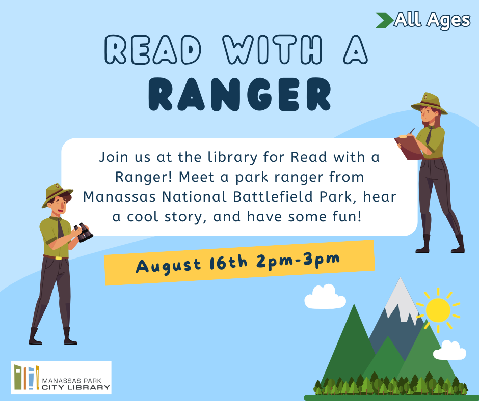 Join us at the library for Read with a Ranger! Meet a park ranger from Manassas National Battlefield Park, hear a cool story, and have some fun!
