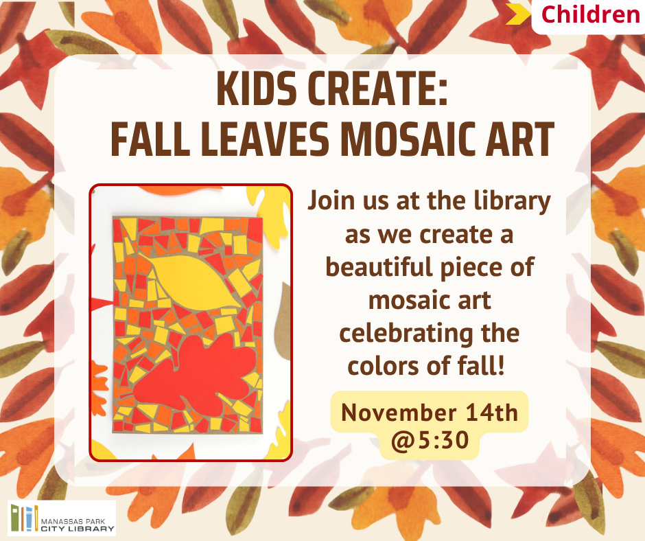 Join us at the library as we create a beautiful piece of mosaic art to celebrate the colors of fall!