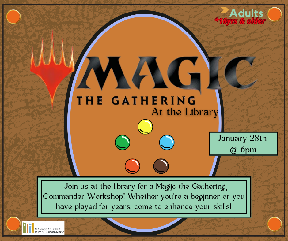 Join us at the library for a Magic: the Gathering Workshop! Whether you’re a beginner or you have played for years, come enhance your skills!